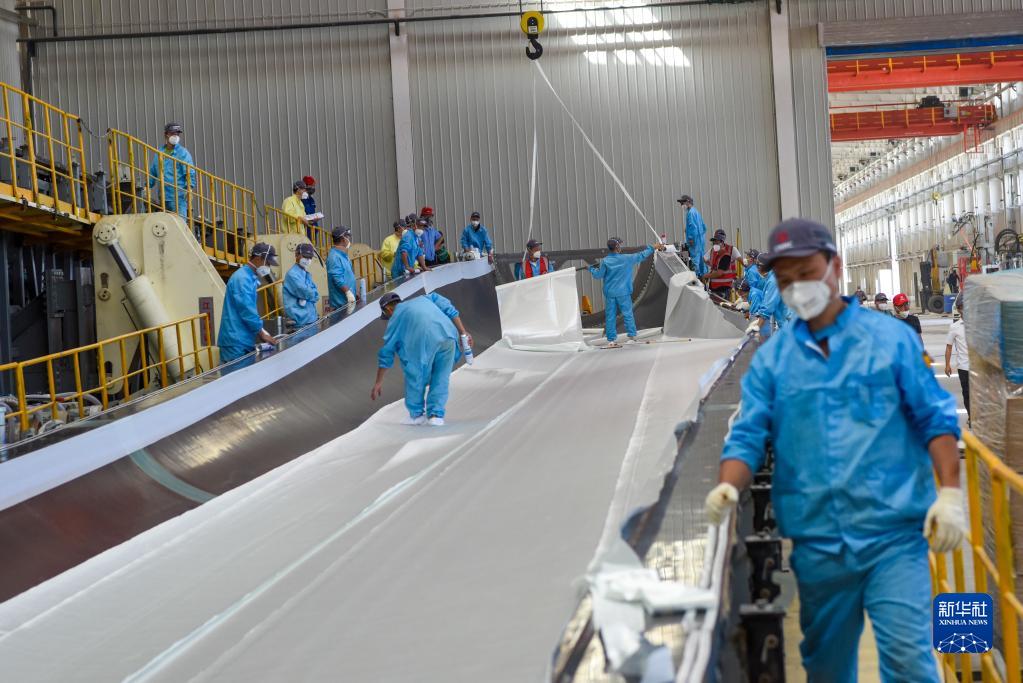 新疆生產(chǎn)建設兵團新星經(jīng)濟技術(shù)開(kāi)發(fā)區一家風(fēng)電葉片企業(yè)的員工在車(chē)間忙碌(2022年7月27日攝)。新華社記者 丁磊 攝