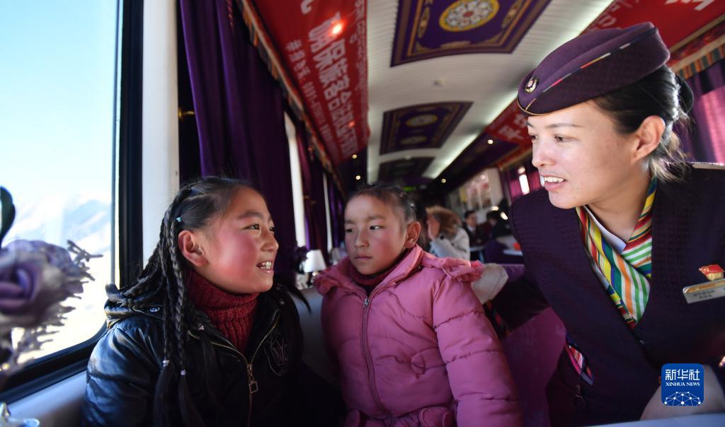 青藏鐵路拉薩至日喀則段的藏族女列車(chē)長(cháng)貢久曲珍(右)與乘客聊天(2020年1月12日攝)。新華社記者 覺(jué)果 攝