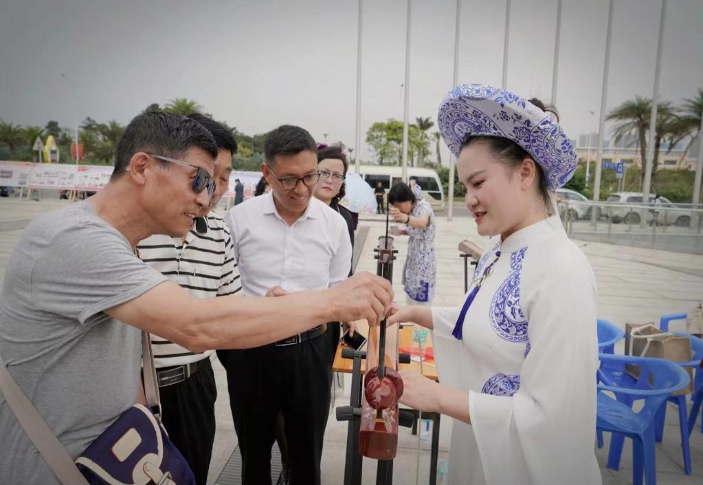 趙霞(右)在展示京族獨弦琴。(受訪(fǎng)者供圖)