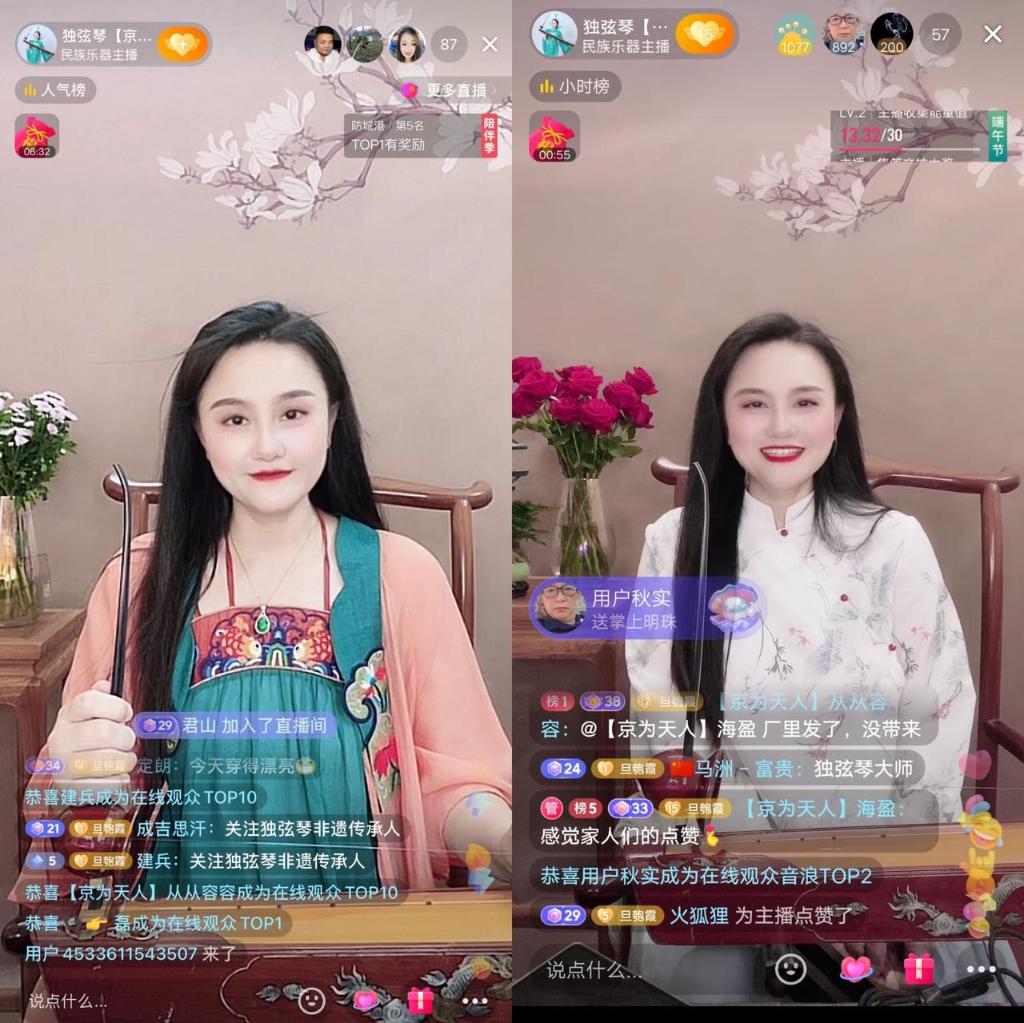 如何讓更多的人認識和傳播獨弦琴藝術(shù)?一次刷手機短視頻的時(shí)候,趙霞想到,是否可以借助短視頻直播平臺的傳播力讓更多的人了解獨弦琴?2018年趙霞在抖音平臺注冊了賬號@獨弦琴【京為天人】。剛開(kāi)始直播時(shí),只會(huì )傳統獨弦琴曲目的趙霞面對網(wǎng)友點(diǎn)的流行歌曲,由于自己從沒(méi)有編排過(guò),不知如何彈奏?!耙朐诰W(wǎng)上傳播得更好只會(huì )傳統曲目不行,必須要改變?!壁w霞每次下播后,都會(huì )練習把一些流行歌曲改編成適合獨弦琴演奏的曲調,重新定調、編排指法,再到直播間演奏。