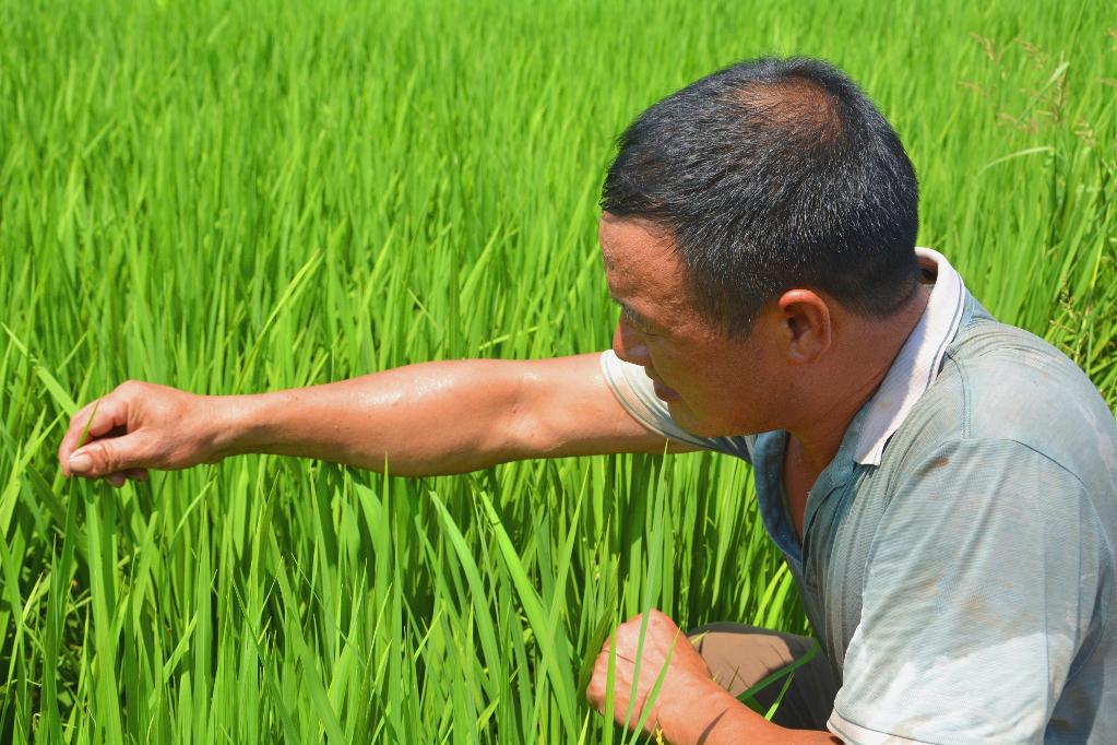 江西信豐縣種糧大戶(hù)張四生蹲在田頭查看水稻恢復情況。(受訪(fǎng)者供圖)