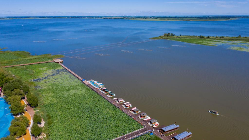 2020年7月20日,游人乘船游覽查干湖(無(wú)人機照片)。新華社記者 張楠 攝