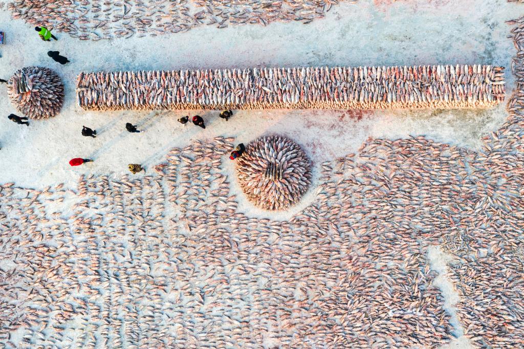 2019年12月27日,在查干湖漁場(chǎng)超市,消費者選購查干湖魚(yú)(無(wú)人機拍攝)。新華社記者 張楠 攝