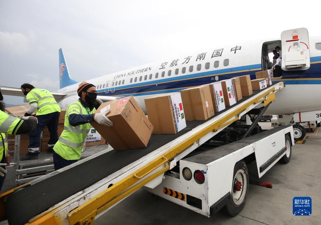 2020年3月28日,在巴基斯坦伊斯蘭堡國際機場(chǎng),工作人員卸載中國捐贈的醫療救治物資。新華社記者 劉天 攝