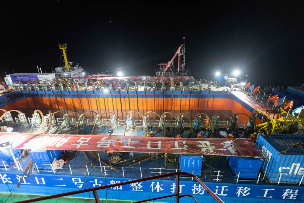 11月20日晚八點(diǎn)半左右拍攝的長(cháng)江口二號古船整體打撈現場(chǎng)。