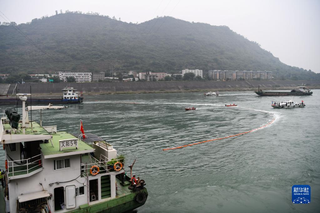 11月9日,在四川省宜賓市敘州區的長(cháng)江流域突發(fā)生態(tài)環(huán)境事件應急綜合演練現場(chǎng),多方部門(mén)協(xié)作在金沙江面布設圍油欄。新華社記者 王曦 攝