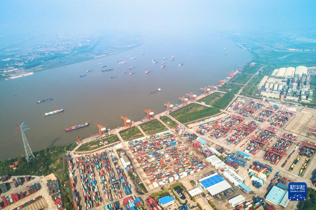 這是武漢長(cháng)江中游航運中心核心港陽(yáng)邏港(2020年4月12日攝,無(wú)人機照片)。新華社記者 肖藝九 攝
