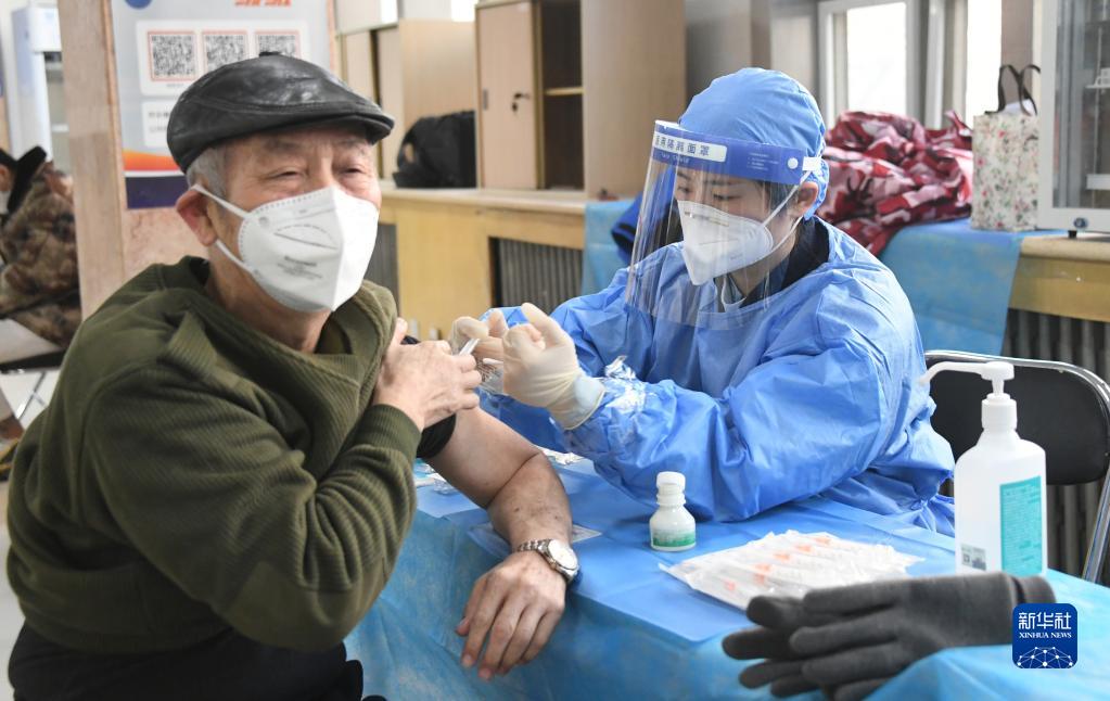 12月15日,在北京市海淀區中關(guān)村街道新冠疫苗接種點(diǎn),醫護人員為老年人接種新冠疫苗。新華社記者 任超 攝