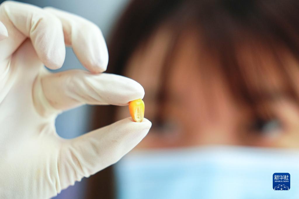在吉林省宏澤現代農業(yè)有限公司實(shí)驗室內,科研人員展示培育的玉米種子(2022年6月7日攝)。 新華社記者 許暢 攝