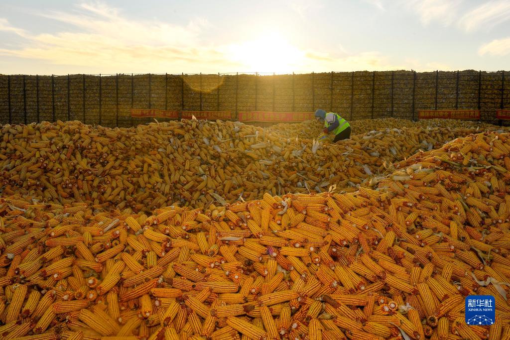 在北大荒集團北安分公司趙光農場(chǎng)有限公司,工作人員在一處曬場(chǎng)的玉米堆上忙碌(2022年10月19日攝)。 新華社記者 王建威 攝