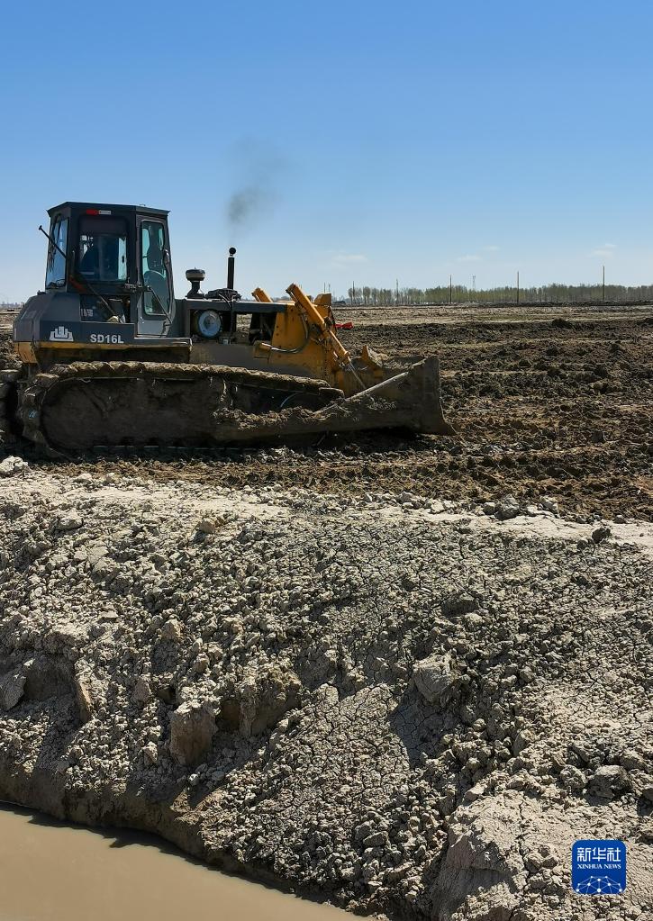 2022年2月22日,在吉林省松原市乾安縣余字鄉歲字村土地整治現場(chǎng),工作人員操作推土機進(jìn)行土地粗平作業(yè)。新華社記者 王帆 攝