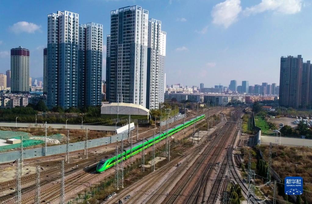 12月26日,昆明經(jīng)新成昆鐵路開(kāi)往成都南的D858次列車(chē)駛出昆明市區。新華社發(fā)(楊森 攝)