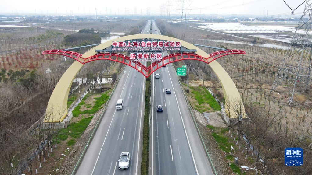 這是2022年2月10日拍攝的S2滬蘆高速上的中國(上海)自由貿易試驗區臨港新片區“海鷗門(mén)”(無(wú)人機照片)。新華社記者 方喆 攝