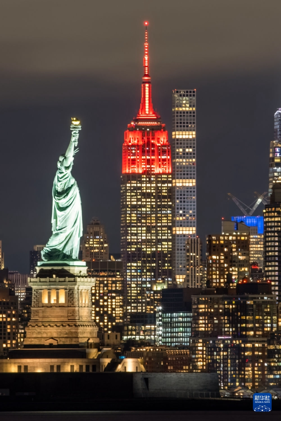 2023年1月20日,美國紐約帝國大廈亮起中國春節主題燈光。新華社發(fā)(周煥新攝)