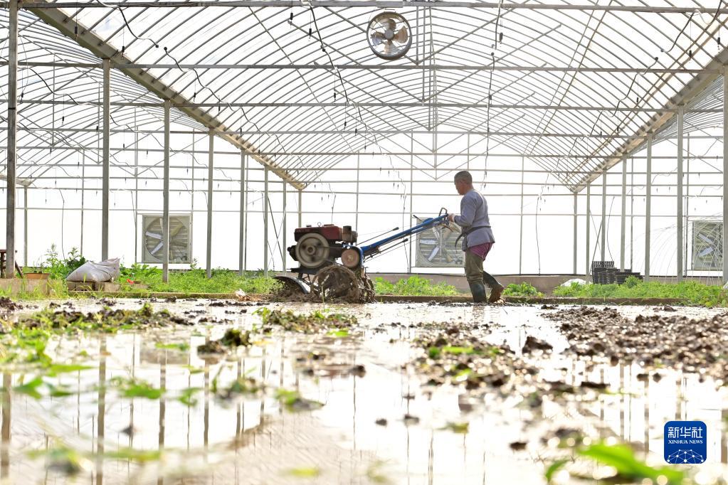 1月29日,在湖南省婁底市雙峰縣青樹(shù)坪鎮歸古新村,農民駕駛農機在大棚內整地。新華社發(fā)(李建新 攝)