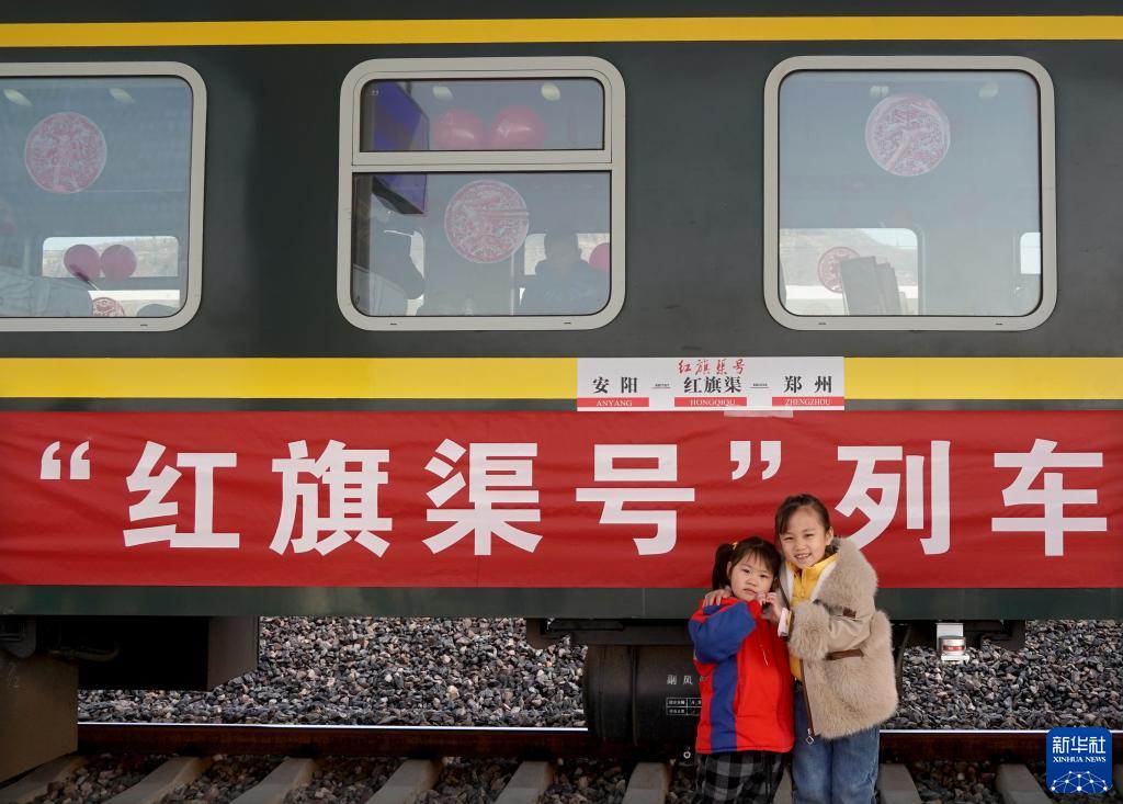 1月20日,在河南林州的鐵路紅旗渠站,兩名小朋友在“紅旗渠號”列車(chē)旁留影。新華社記者 李安 攝