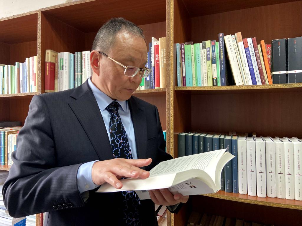 2月23日,湯維建在辦公室翻閱法律書(shū)籍。新華社記者魏夢(mèng)佳 攝