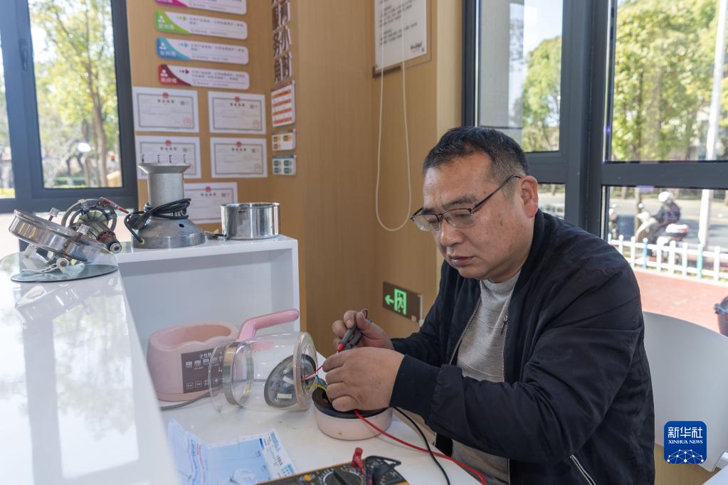 3月14日,上海市松江區中山幸福里社區的維修師傅張輝在為居民修理小家電。 新華社記者 王翔 攝