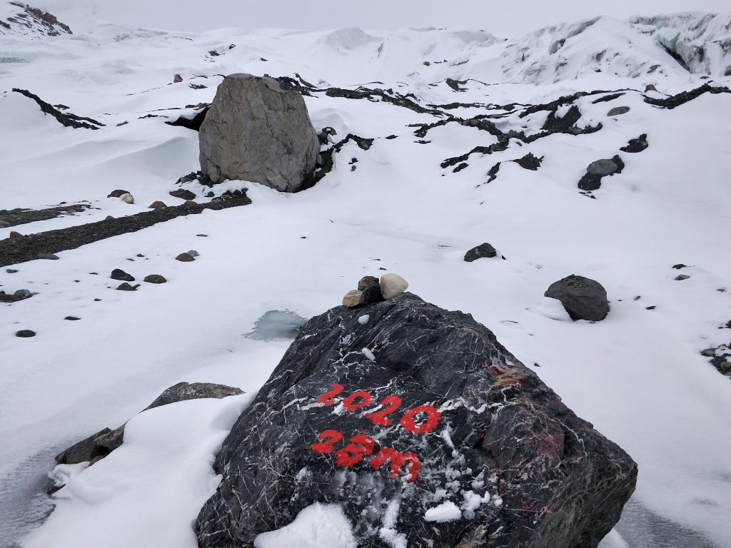 這是冰川監測隊2020年在冰川下做過(guò)標記的一塊石頭。(受訪(fǎng)者供圖)