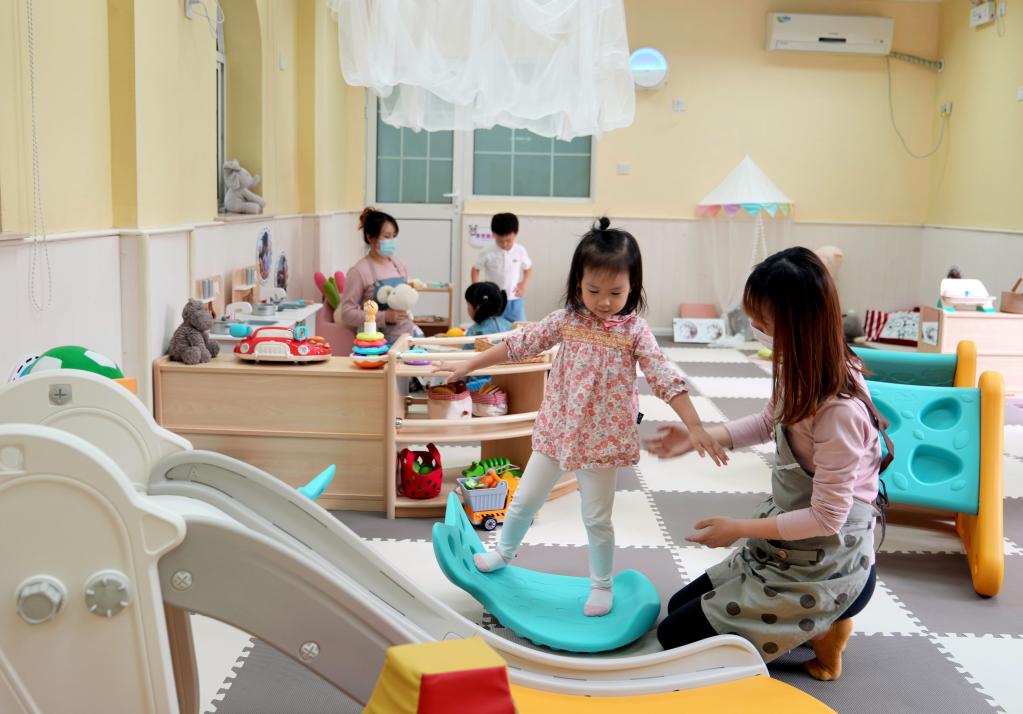 2022年11月1日,在新建成的浙江省杭州市西湖區北山街道托育中心,老師帶著(zhù)小朋友們玩游戲。該托育中心主要招收0至3歲的嬰幼兒。新華社記者江漢 攝