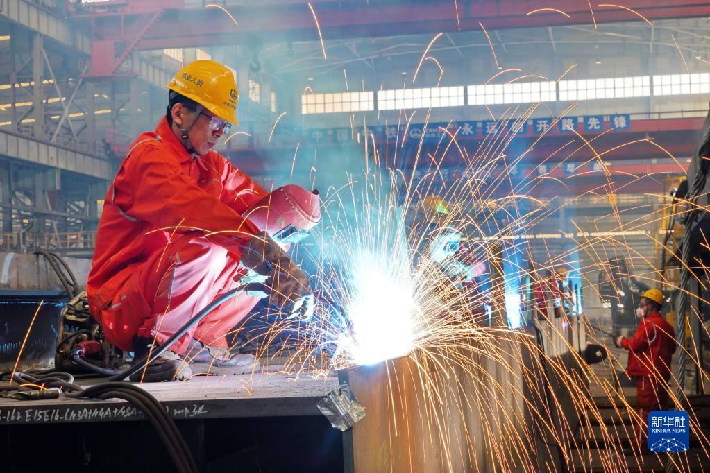 張明在中鐵山橋集團有限公司車(chē)間內進(jìn)行電焊作業(yè)(4月24日攝)。新華社記者 朱旭東 攝