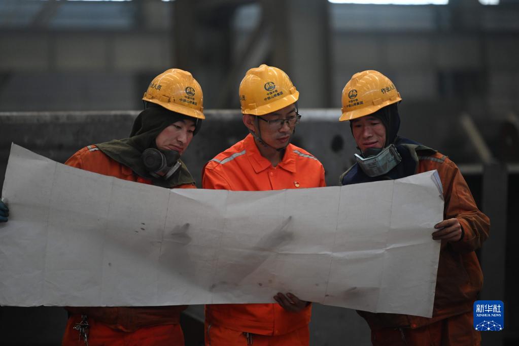 張明(中)和同事在中鐵山橋集團有限公司車(chē)間內查看圖紙(4月24日攝)。新華社記者 朱旭東 攝
