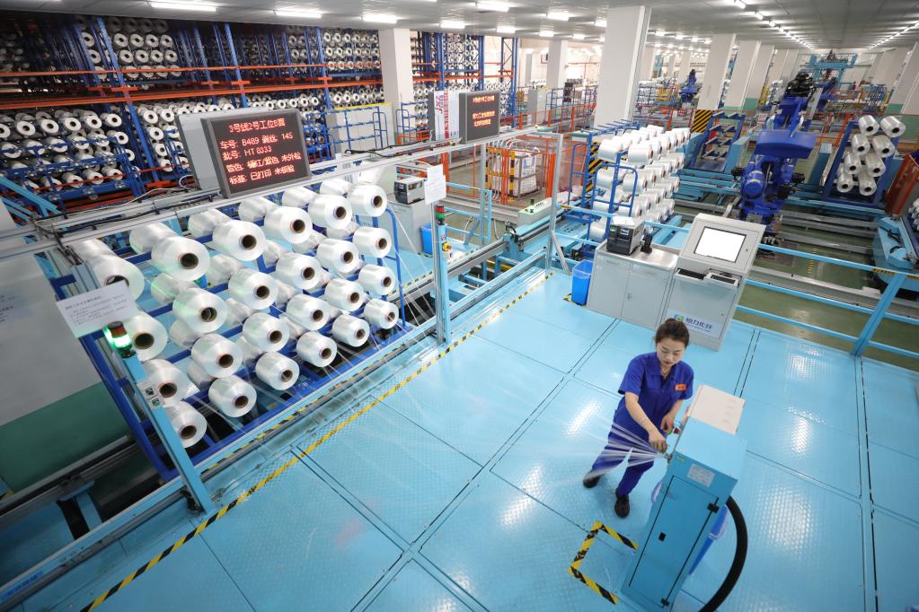 在位于江蘇省蘇州市吳江區的恒力(蘇州)產(chǎn)業(yè)園內的高性能滌綸工業(yè)絲智能車(chē)間內,員工對工業(yè)絲進(jìn)行包裝前的外檢作業(yè)(3月15日攝)。新華社記者 毛俊 攝