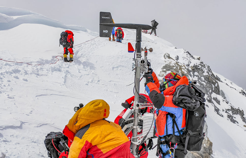 當日凌晨3時(shí),科考隊員從海拔8300米的突擊營(yíng)地出發(fā),歷經(jīng)數小時(shí)攀登,終于抵達海拔8830米的世界最高自動(dòng)氣象觀(guān)測站。固定鋼筋繩索,更換蓄電池,安裝風(fēng)速風(fēng)向傳感器……經(jīng)過(guò)約1小時(shí)的緊張工作,氣象站零部件升級工作全部完成。隨后,他們攀登至8848.86米的峰頂,利用工具成功采集雪冰樣品。