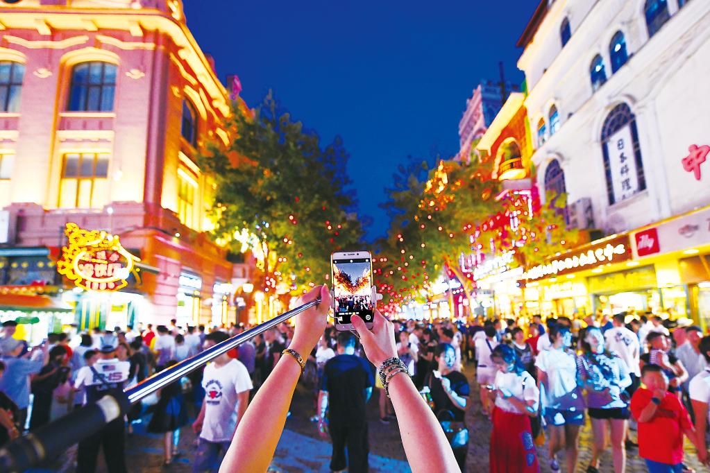 一年四季,中央大街游人如織。夏日,被日光染成濃淡不一的道旁樹(shù),猶如一張張傘,讓行人身感陣陣清涼;秋日,午后陽(yáng)光慵懶地灑在臉上,踏著(zhù)街上隨風(fēng)飄落的樹(shù)葉,漫步老街沉浸于濃濃秋意;冬日,雪花簌簌飄落,走著(zhù)走著(zhù)就“白了頭”。與自然景觀(guān)相比,更多人還是喜歡撫摸老建筑光影婆娑的外墻,在夜幕下尋找陽(yáng)臺音樂(lè )會(huì )等多元文化符號……中西文化在這里交融綻放。