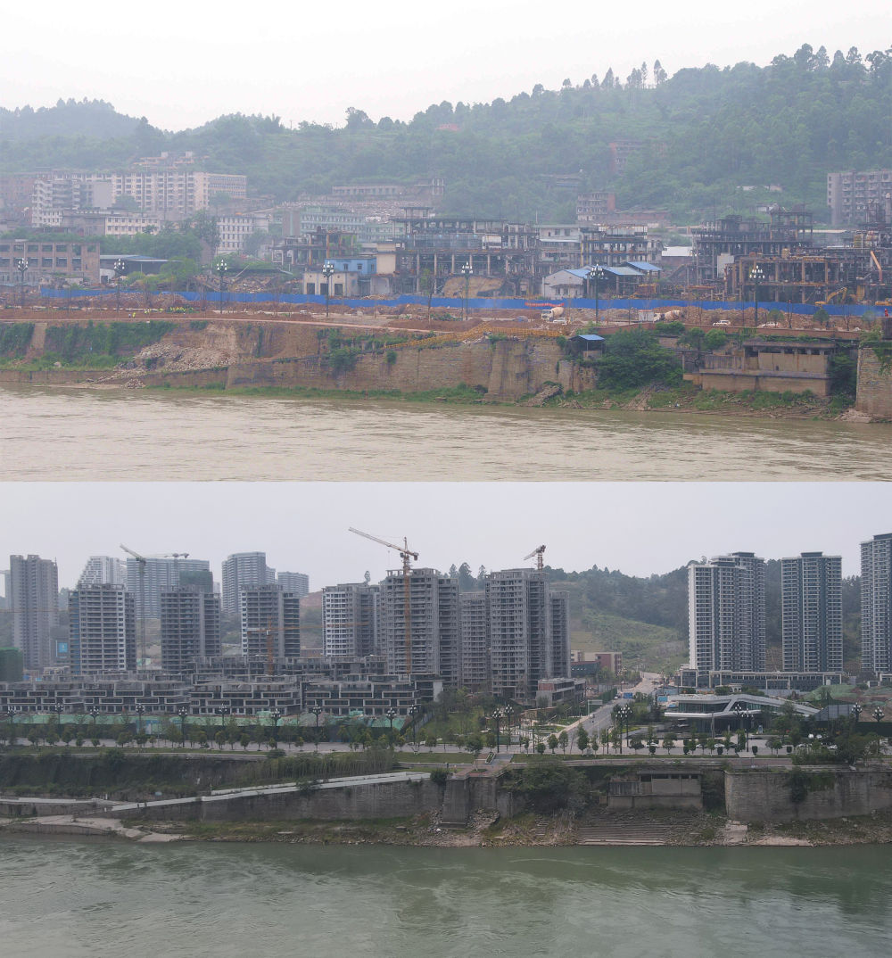 這是一張拼版照片,上圖為:在距離長(cháng)江干流零公里處5公里的長(cháng)江北岸,宜賓天原化工廠(chǎng)老廠(chǎng)區偌大的一片廠(chǎng)房正被拆除(2018年6月22日新華社記者胡旭攝);下圖為:在同一位置拍攝的原宜賓天原化工廠(chǎng)老廠(chǎng)區舊址今日新貌(無(wú)人機照片,2023年5月31日新華社記者劉坤攝)。新華社發(fā)
