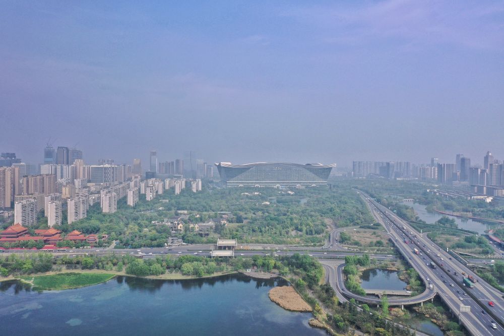 這是2022年4月6日拍攝的成都錦城湖及錦城公園(無(wú)人機照片)。新華社記者 劉坤 攝