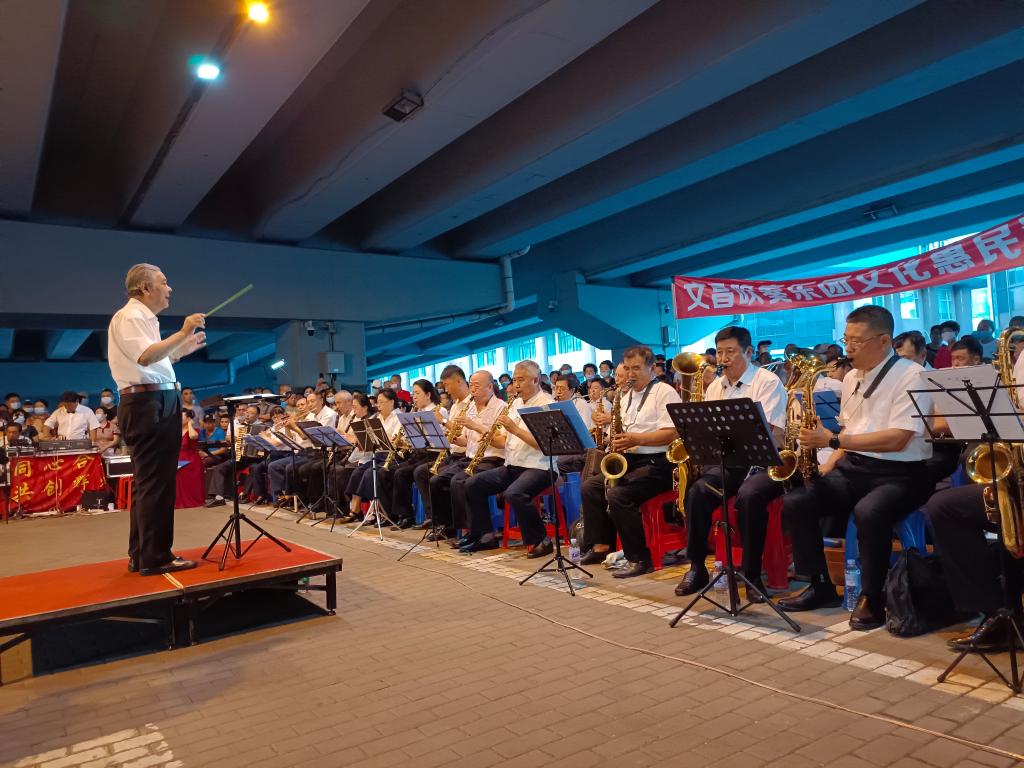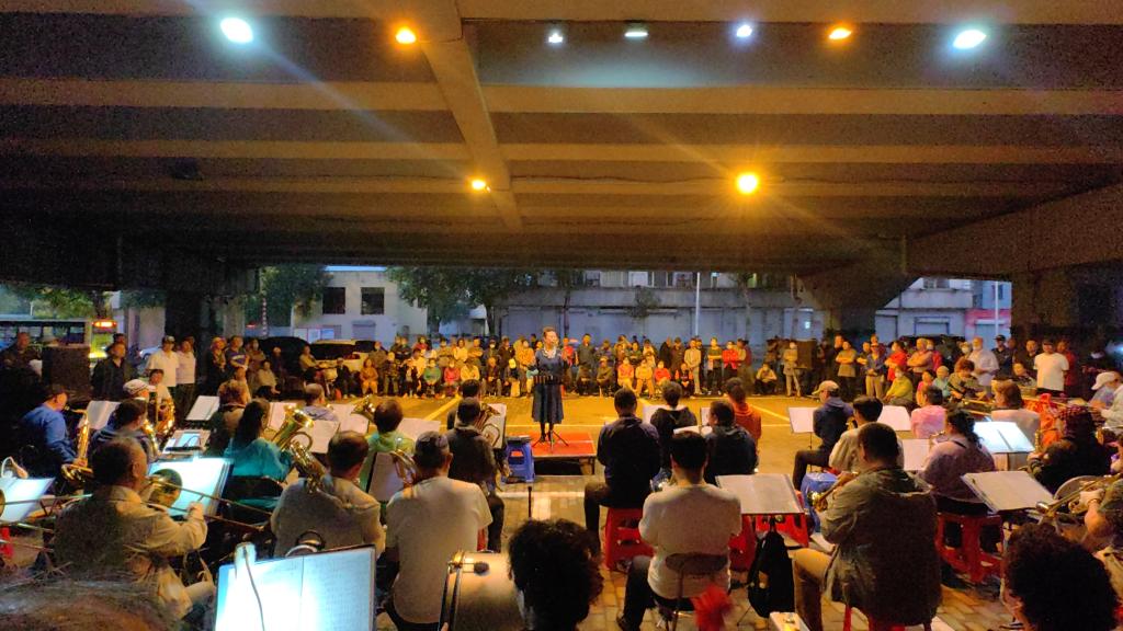 “首先介紹一下今天的指揮,王輝老師……下面請欣賞吹奏樂(lè )《山楂樹(shù)》?!鄙碇?zhù)旗袍的主持人劉麗華緩步下臺,隨著(zhù)指揮快速揮動(dòng)手臂,橋下被悠揚的音樂(lè )聲環(huán)繞,樂(lè )手們配合默契,觀(guān)眾也會(huì )跟著(zhù)哼唱。樂(lè )曲奏畢,掌聲雷動(dòng)。