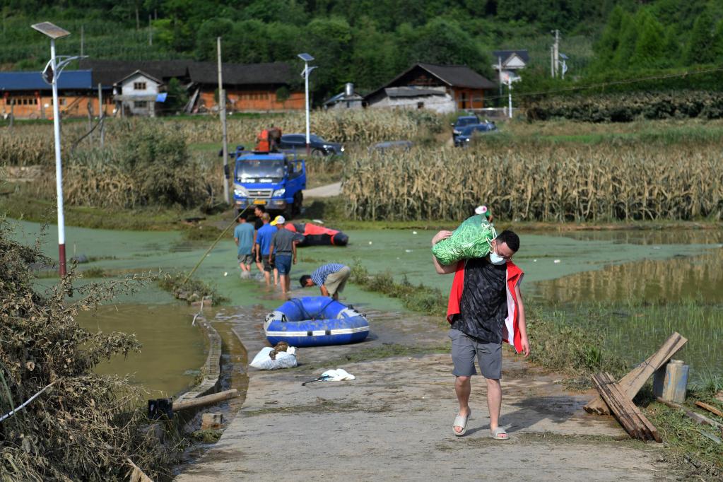 7月3日,在湖南湘西州保靖縣陽(yáng)朝鄉猛科村,志愿者在搬運救災物資。新華社記者 陳振海 攝