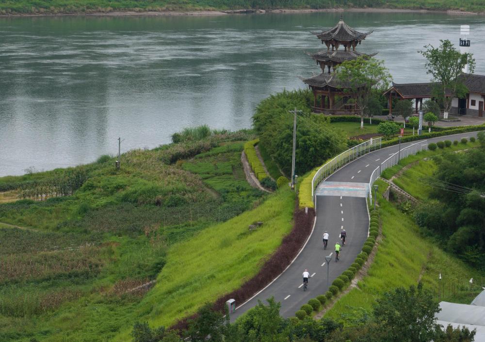 騎行愛(ài)好者騎行在長(cháng)江環(huán)線(xiàn)綠道四川宜賓市南溪區長(cháng)江村段上(2023年6月29日攝,無(wú)人機照片)。新華社記者 江宏景 攝