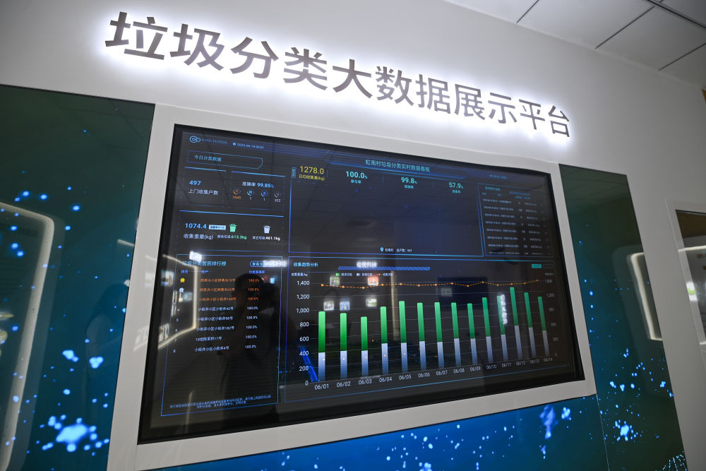 這是2023年6月15日在浙江省嘉興市秀洲區王江涇鎮虹南村拍攝的垃圾分類(lèi)數字化大屏,可以實(shí)時(shí)顯示村民當天垃圾分類(lèi)的實(shí)行情況。新華社記者 徐昱 攝