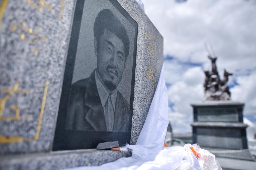 這座石碑鐫刻著(zhù)杰?!に髂线_杰的名字。20多年前,為了保護瀕危的藏羚羊,他與盜獵分子槍?xiě)鸬缴詈笠豢?,遺體被凍結成冰雕。