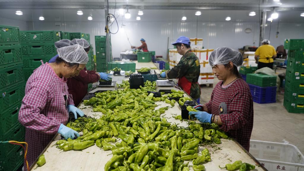 時(shí)值正午,屋外烈日當空,屋內一片涼爽。在恒溫26攝氏度的分揀廠(chǎng)房中,工人們正修剪、挑選、打包,一盒盒包裝精致的青椒、土豆等被送進(jìn)物流箱,等待發(fā)貨。