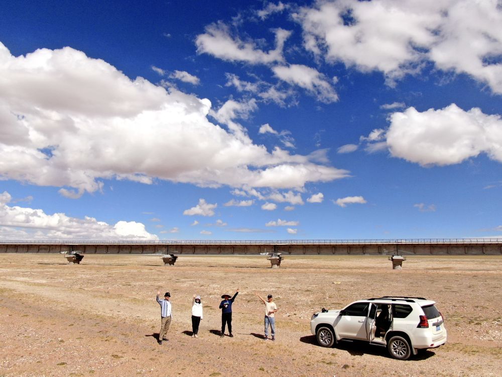 2021年7月7日,王金金(左二)在可可西里索南達杰保護站附近采訪(fǎng)。新華每日電訊記者 張龍 攝