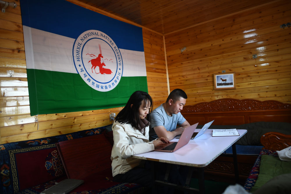 6月16日,王金金(左)在可可西里卓乃湖保護站內寫(xiě)稿。新華每日電訊記者 張宏祥 攝