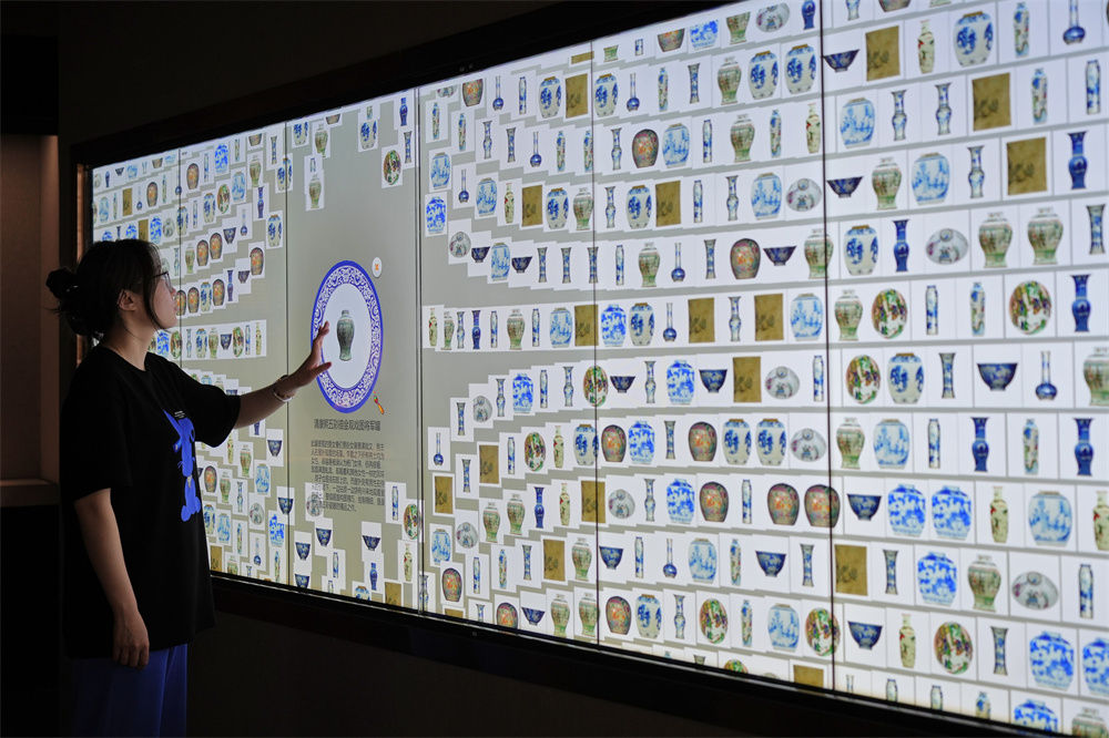 在山東煙臺博物館,觀(guān)眾通過(guò)互動(dòng)屏幕了解中國古代瓷器(2023年5月18日攝)。新華社發(fā)(唐克 攝)