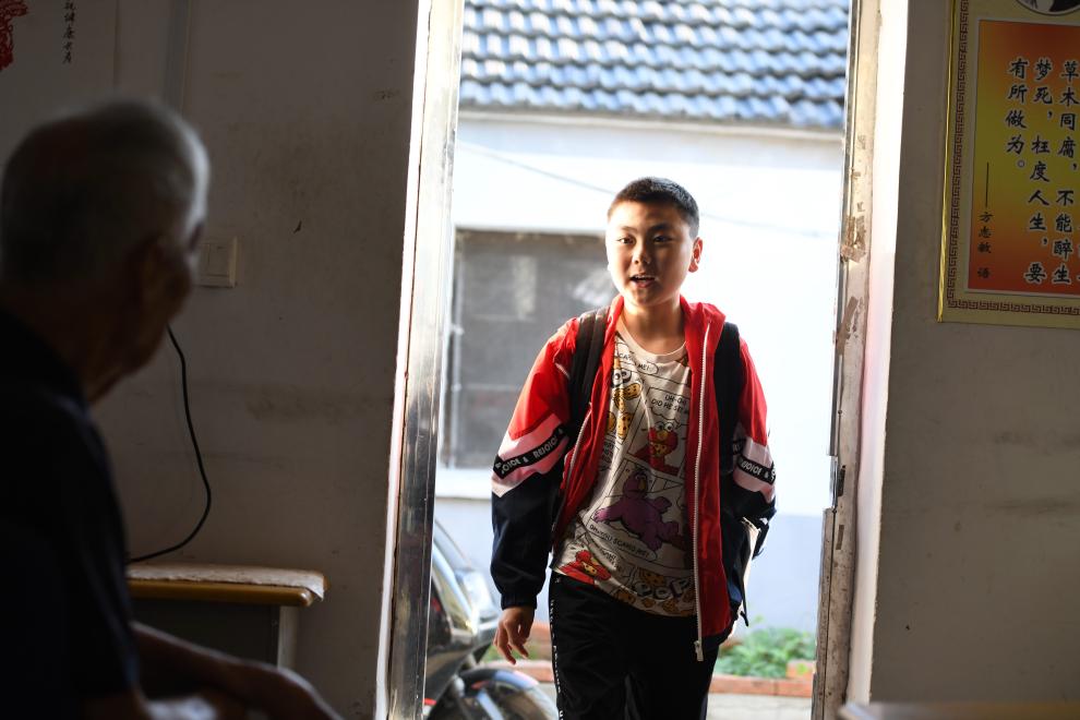 9月9日,一名學(xué)生走進(jìn)“留守未成年人之家”教室,向葉連平打招呼。新華社記者 張端 攝