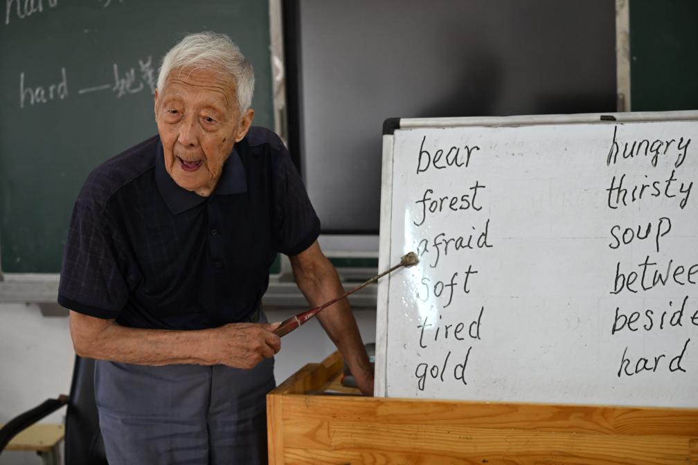 雖然年過(guò)九旬,滿(mǎn)頭銀發(fā)的葉連平講起英語(yǔ)課來(lái)發(fā)音標準、聲音洪亮,孩子們聽(tīng)得十分專(zhuān)注。