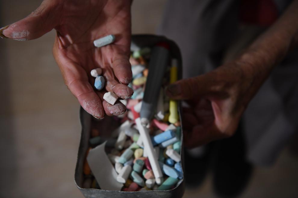 9月9日,葉連平展示他仍在使用的粉筆頭。新華社記者 張端 攝