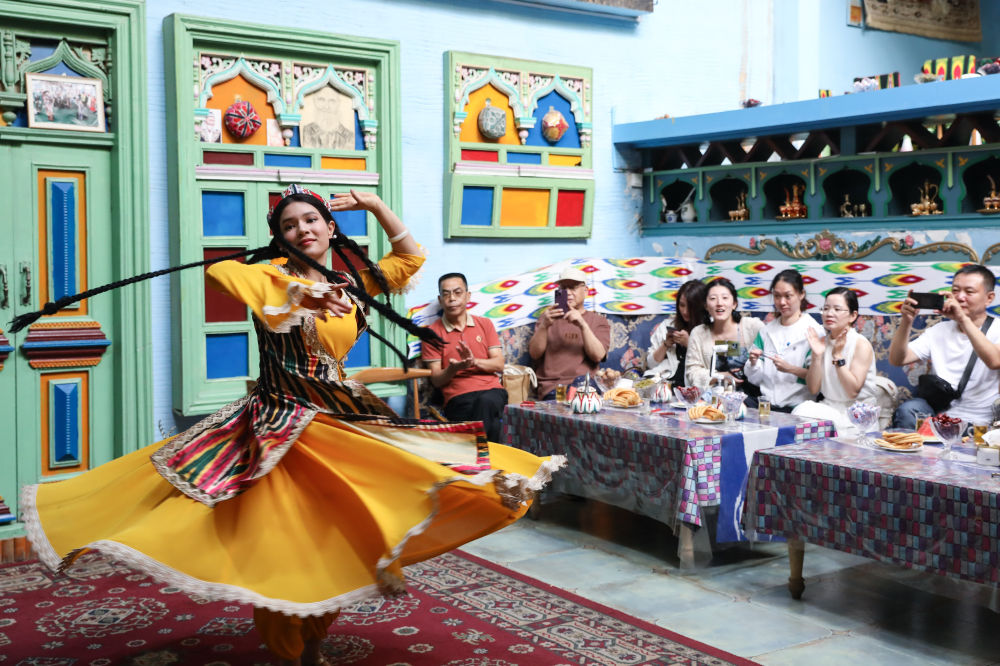 演員在新疆喀什古城景區“古麗的家”旅游家訪(fǎng)點(diǎn)表演舞蹈(2023年9月7日攝)。新華社記者 程婷婷 攝
