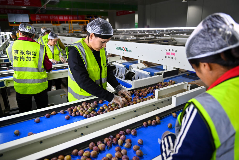 在新疆伽師縣粵伽新梅產(chǎn)業(yè)園內的京東物流新疆智能供應鏈中心,員工在智能分揀線(xiàn)檢查分選好的新梅(2023年8月30日攝)。新華社記者 丁磊 攝