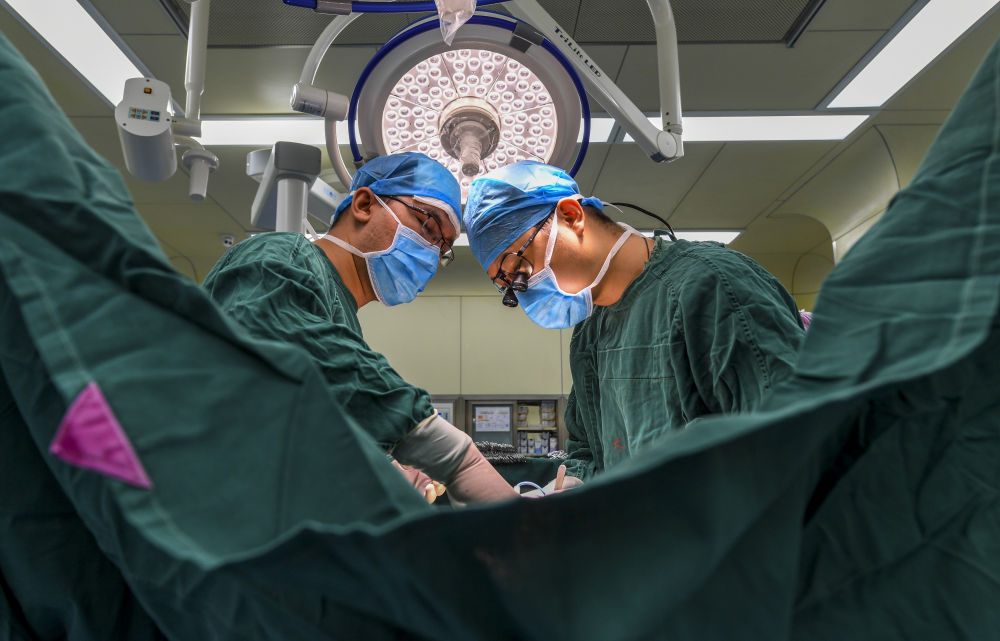 在新疆喀什地區第二人民醫院手術(shù)室,上海援疆醫生張俊文(右)和當地醫生阿迪力江為患者做二尖瓣置換手術(shù)(2018年11月23日攝)。阿迪力江是張俊文負責培養的年輕醫生之一。新華社記者 胡虎虎 攝