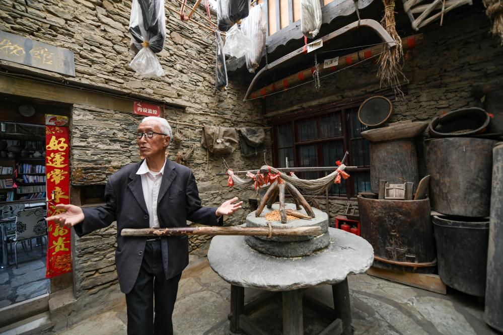 在四川省阿壩州理縣桃坪羌寨,王嘉俊老人介紹“腰磨”。新華社記者王曦 攝