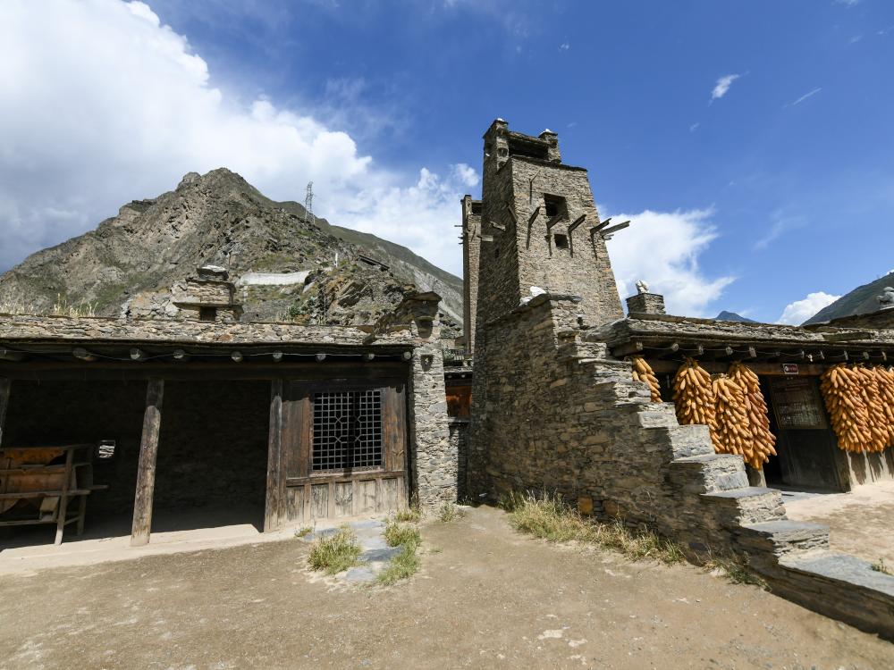 游客必去之處是最高處的碉樓,沿山而上,爬過(guò)層層獨木梯,登上數丈高的碉樓,山巒河谷一覽無(wú)余。羌族群眾在碉樓上供奉著(zhù)白石和羊角,檐下是金燦燦的玉米棒。