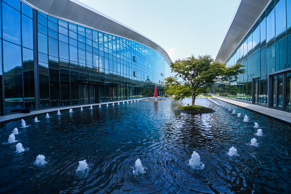 這是杭州富陽(yáng)水上運動(dòng)中心的中庭花園(8月24日攝),水池中的水來(lái)自于循環(huán)利用的雨水。新華社記者 徐昱 攝