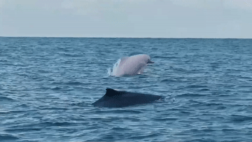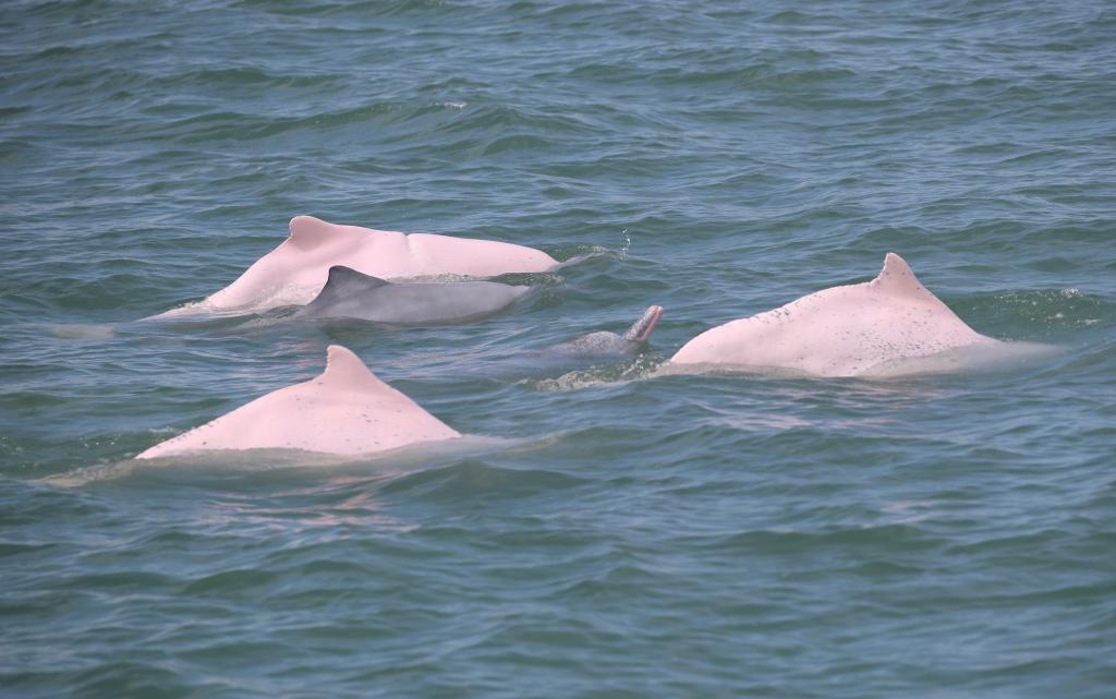 廣西欽州市三娘灣海域,一頭野生中華白海豚在自由嬉戲。新華社記者 周華 攝